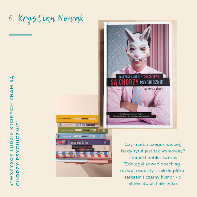 Twórca ,,Zdelegalizować coaching i rozwój osobisty" zabrał się za książkę i powstał tytuł ,,Wszyscy ludzie których znam są chorzy psychicznie". Świetna książka o millenialsach, ale nie tylko. Szastanie lajkami, rozmowy z nieżyjącymi noblistami, dyskusje z kotami - a wszystko to w otoczce czarnego humoru, sarkazmu i ironii.
